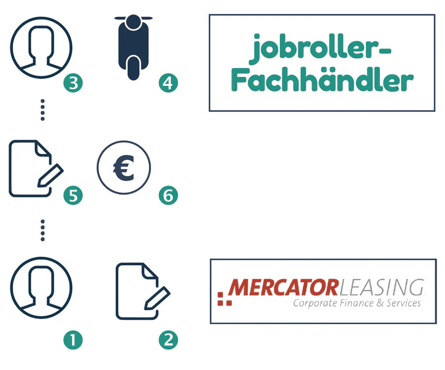 Zuerst muss der Arbeitgeber mit uns Kontakt aufnehmen und (1) schließt dann einen Rahmenvertrag mit der Mercator-Leasing sowie Nutzungsüberlassungsverträge (5) mit den Mitarbeitern (3) ab.