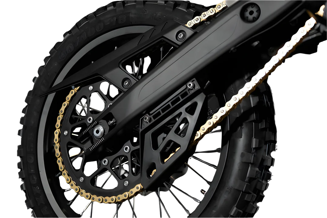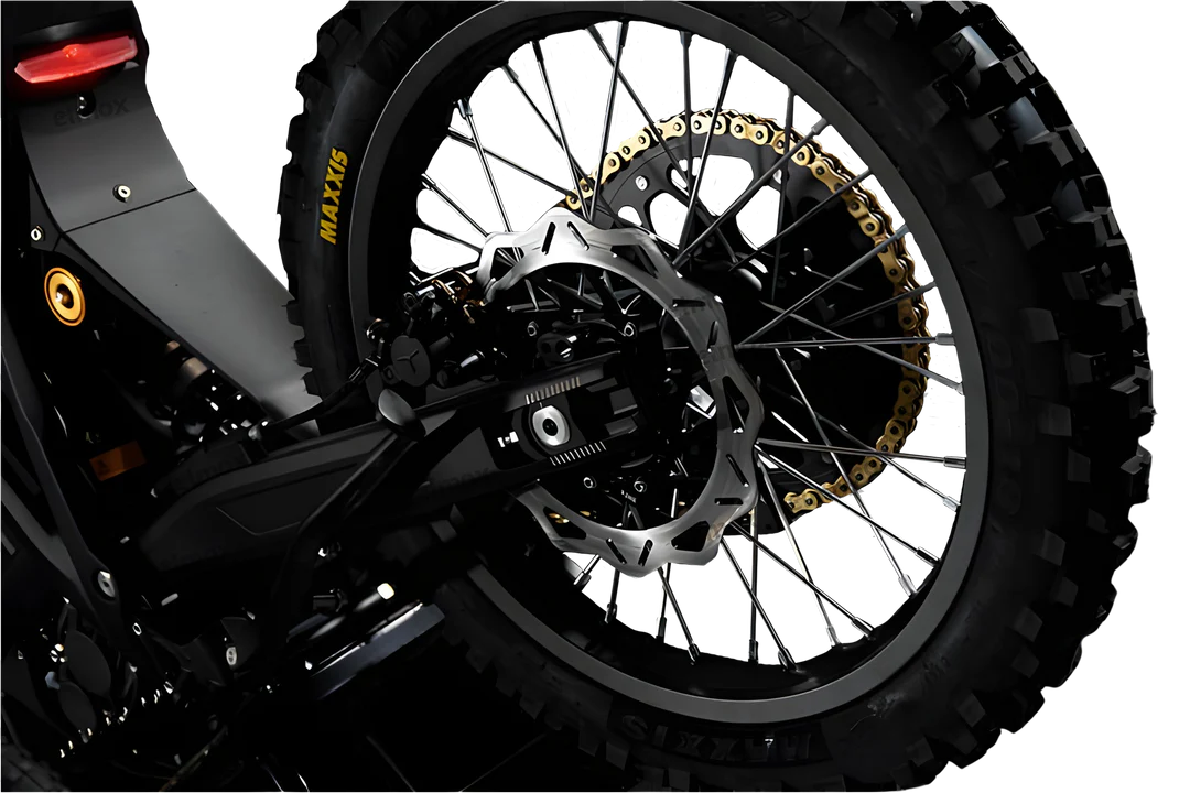 Mit 21″ vorn und 18″ hinten steht der Komodo auf echter Offroad-Ausrüstung. Mit den Maxxis-Reifen– ist der Grip ist brutal. Die 520-Kettenführung schützt das Antriebssystem vor Schmutz und Steinen, während die robuste Alufelge für Stabilität sorgt, wenn’s ruppig wird.